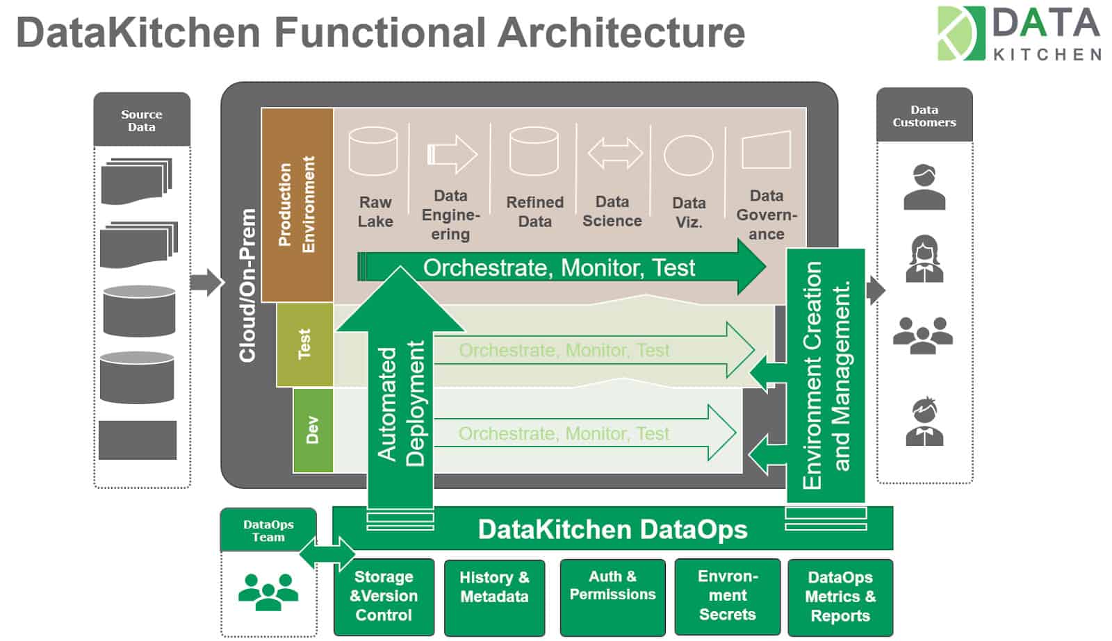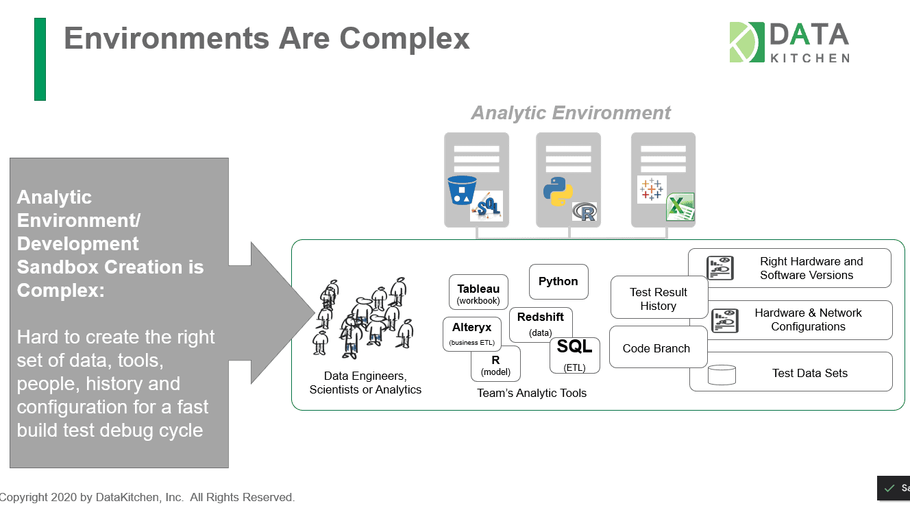 Compared to software development environments, creating analytic development environments is complex. The development of new data analytics requires the joining of test data, hardware-software environments, version control, toolchains, team organization, and process measurement. The DataKitchen DataOps Platform uses ‘Kitchens’ to abstract environments that contain all the pre-configured tools, datasets, machine resources, and tests – everything users need to create and innovate. Kitchens provide users with a controlled and secure space to develop new analytics and experiment.