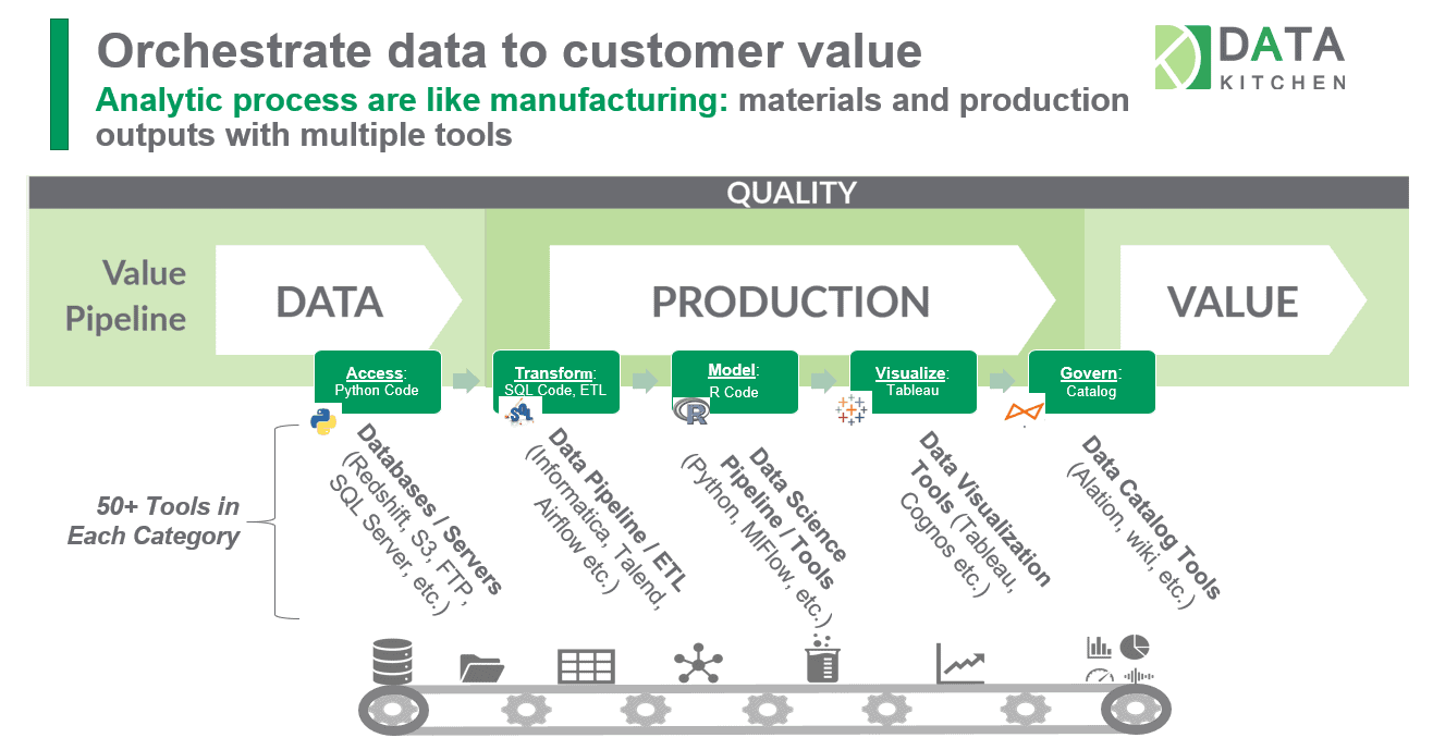 There are hundreds of tools for data engineering, data science, analytics, self-service, governance, and databases. Meta-orchestration of the complex toolchain across the end-to-end data analytics process is a crucial element of DataOps.