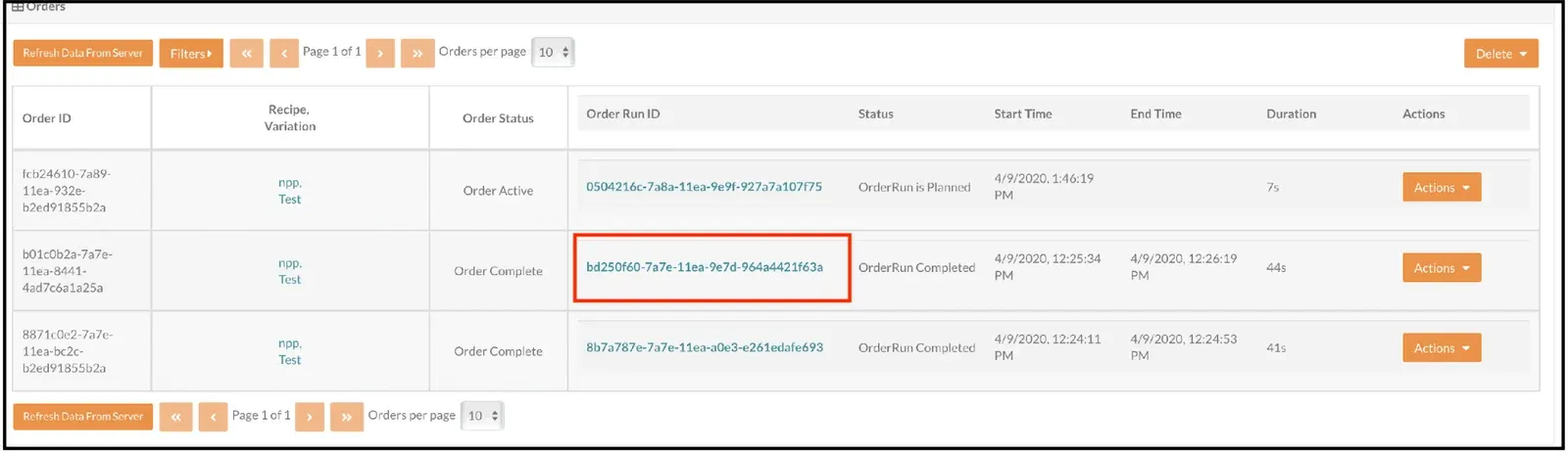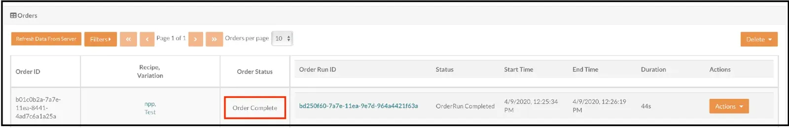 On the Orders screen, click the Refresh Data From Server button if needed to display the OrderRun ID for the Order. In this case, our Order has completed running, and the Order status is Order Complete.