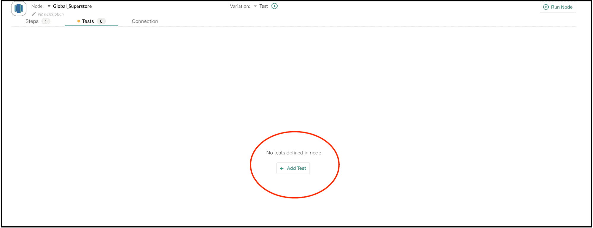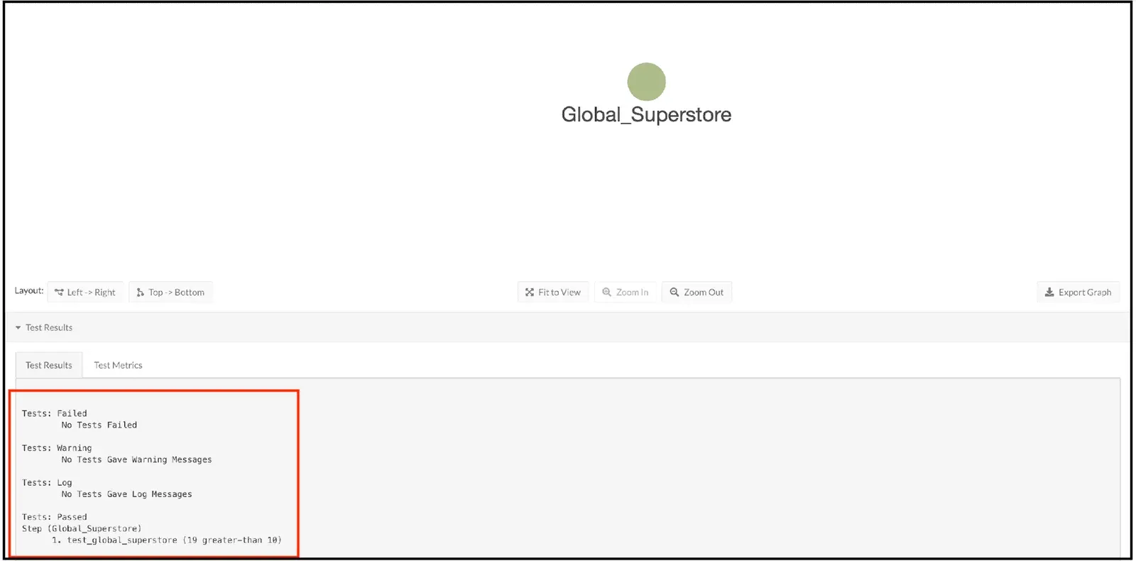 Scroll below the graph and expand the Test Results section. In the Test Results, we can see that the test did not fail, it did not produce a warning, and it did not record any messages in the log. The Tests: Passed section shows one test for the Node ‘Global_Superstore’, named ‘test_global_superstore’, and the values from that test. This is the test that we defined above. Nineteen records were counted in the data table, and this is indeed greater than our ‘Control Value’ of ten.