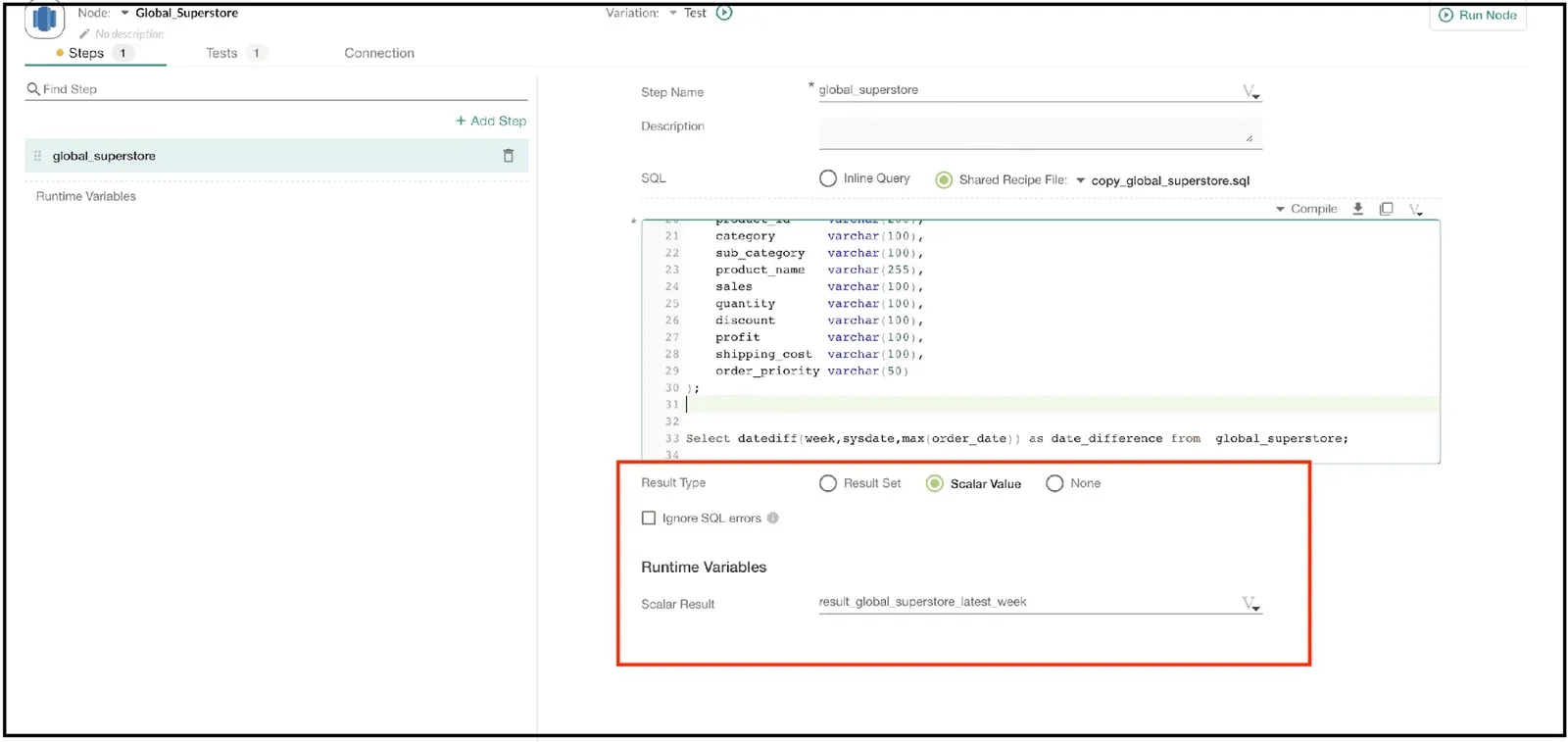 Let’s take a look at another example test. The test in this section verifies that we are using the latest version of the data. If we are using stale data, the difference between the date of the most recent Node and today’s date will be more than one week. In the below screenshot, we can see that the last line of the SQL script calculates the difference in weeks between the current system date and the maximum (latest) sales order date. The resultant value is assigned to the runtime variable result_global_superstore_latest_week. If the data is current, the value in result_global_superstore_latest_week will be ‘-1’. If the data hasn’t been updated this week, then the calculated value will be ‘-2’.