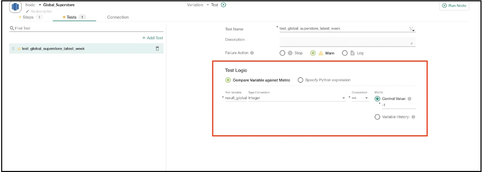 In this step we select the test variable result_global_superstore_latest_week created in the previous step, and select ‘integer’ under the ‘Type Conversion’ section. The comparison operator is ‘==’ (test if one value equals another) and ‘Control Value’ is a ‘-1’. In other words, the test verifies that result_global_superstore_latest_week is equal to ‘-1’. If it is any other value, the test will fail. Next, we update the changes and run the Variation.