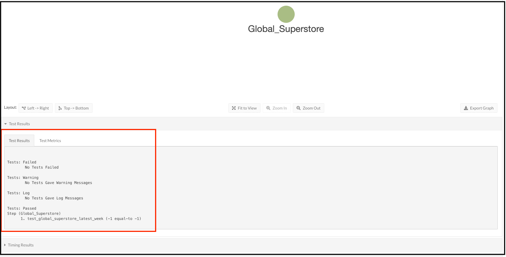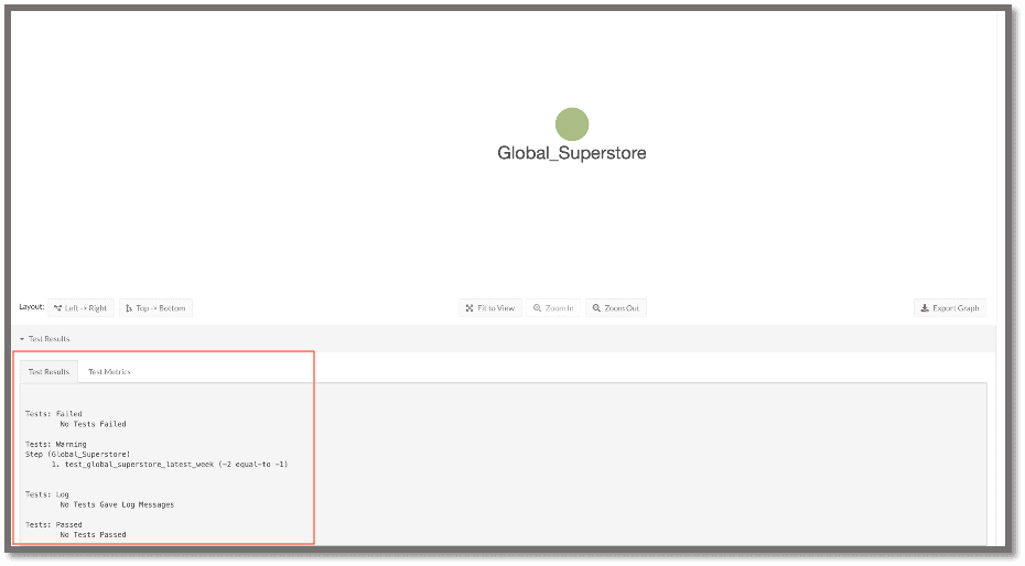 Scroll below the graph and expand the Test Results section. The Tests: Passed section shows one test for the Node ‘Global_Superstore’, named ‘test_global_superstore_latest_week’, and the values in that test. We can see that the test passed because the result_global_superstore_latest_week was equal to ‘-1’.