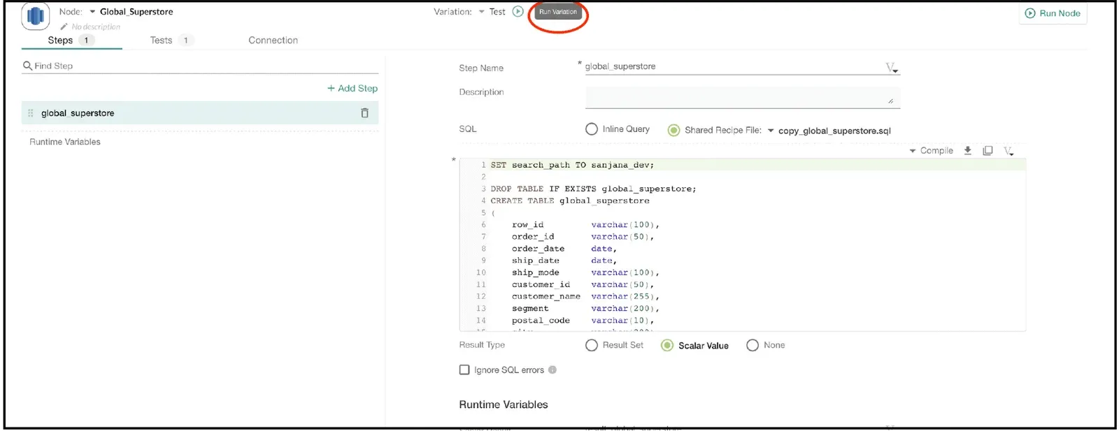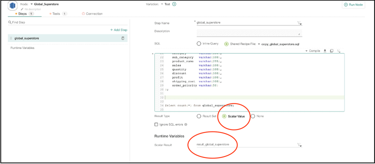 The screenshot below shows the DataKitchen UI for creating a test of a Variation. Since the count is a scalar value, we select the result type as scalar value and define a runtime variable result_global_superstore.