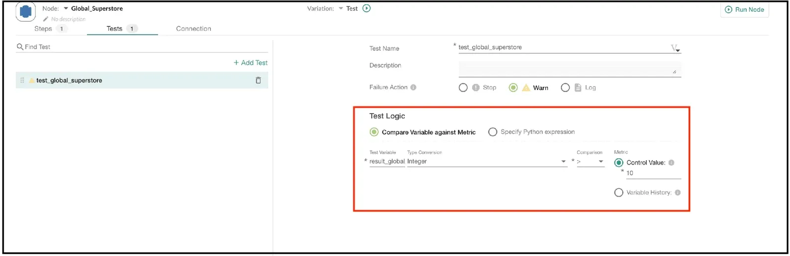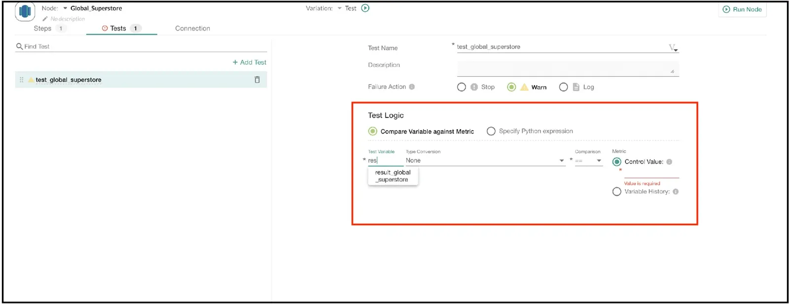 Click on the ‘Test Variable’ field to view a list of available variables. Select result_global_superstore , which was defined earlier. Suppose that we wish to verify that the value is greater than ten. In a real-world application, this might be a historical balance test. For example, the number of YTD sales orders should never decline.