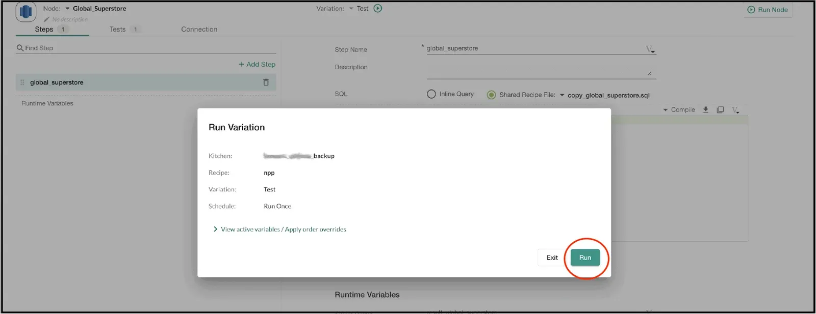 Click the Run Variation option in the DataKitchen UI. Then click the Run button in the Run Variation overlay.