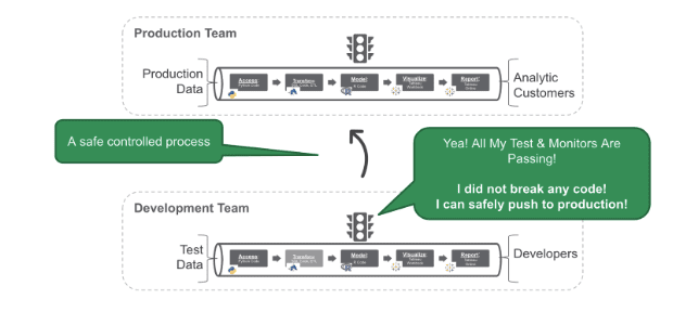 But what about during development? Doesn’t lineage help me tell the impact of my code change? Yes, it does – to a point. Data lineage does not provide detailed regression, functional, or performance test results. Testing data and analytic systems require a development system with accurate test data, tools, and relevant tool code. All of those things come together with an overlay of automated tests. Only then can you tell the true impact of a column name change on the data transformations, the models, and the visualization you give to your customers. No software engineer trusts an abstract metamodel of their code to prove that it works in production without running their software code through a series of rigorous automated tests before it gets to production. We must do the same as data analytic teams. DataOps Observability enables this.
