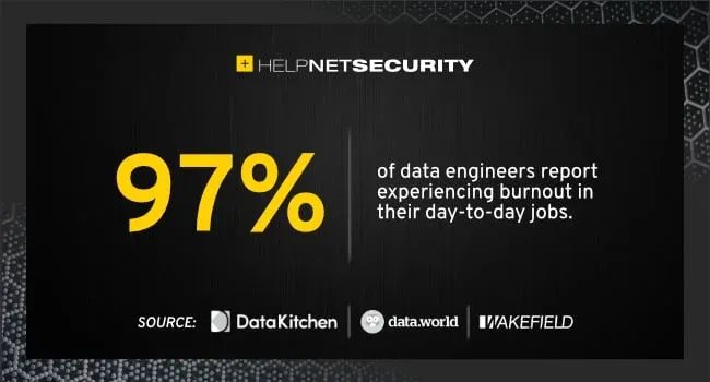 In a recent DataKitchen/data.world survey, 97% of data engineers report experiencing burnout in their day-to-day jobs. 70% say they will likely leave their current company for another data engineering job in the next 12 months. 79% have considered leaving the industry entirely.