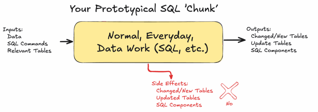 SQL as a language presents inherent challenges for functional programming approaches. Unlike pure functional languages, where functions always return the same output for given inputs, SQL doesn’t naturally lend itself to pure functional patterns for several fundamental reasons. Even Python, the data engineer’s favorite language, is easier to write in functionally.