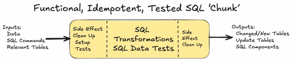 The solution lies in structuring SQL transformations as discrete, self-contained units that explicitly manage their state and dependencies. These Functional and Idempotent chunks—FI chunks—become the fundamental building blocks of FITT-compliant data pipelines implemented in SQL. Making SQL fully functional is an active area of research in databases. Our approach uses the varieties of SQL that come with the top analytics databases today: Redshift, Snowflake, BigQuery, Synapse, etc.