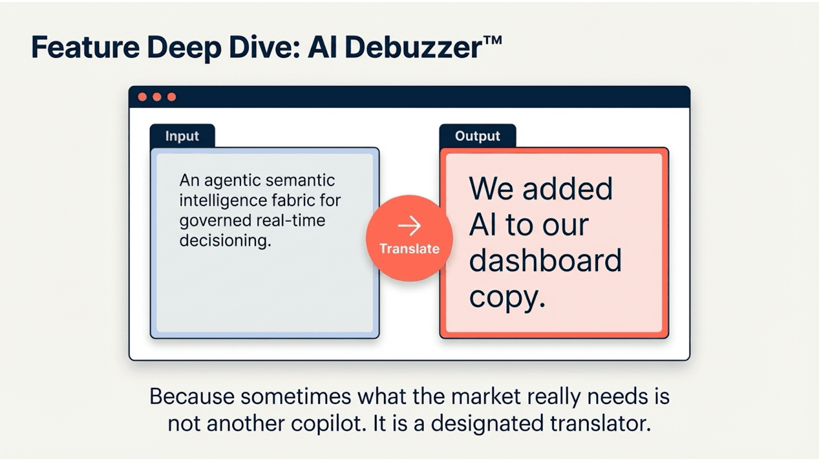Just use BuzzOps on any product page, demo, analyst report, keynote, or LinkedIn post, and AI Debuzzer™ will quickly turn phrases like: