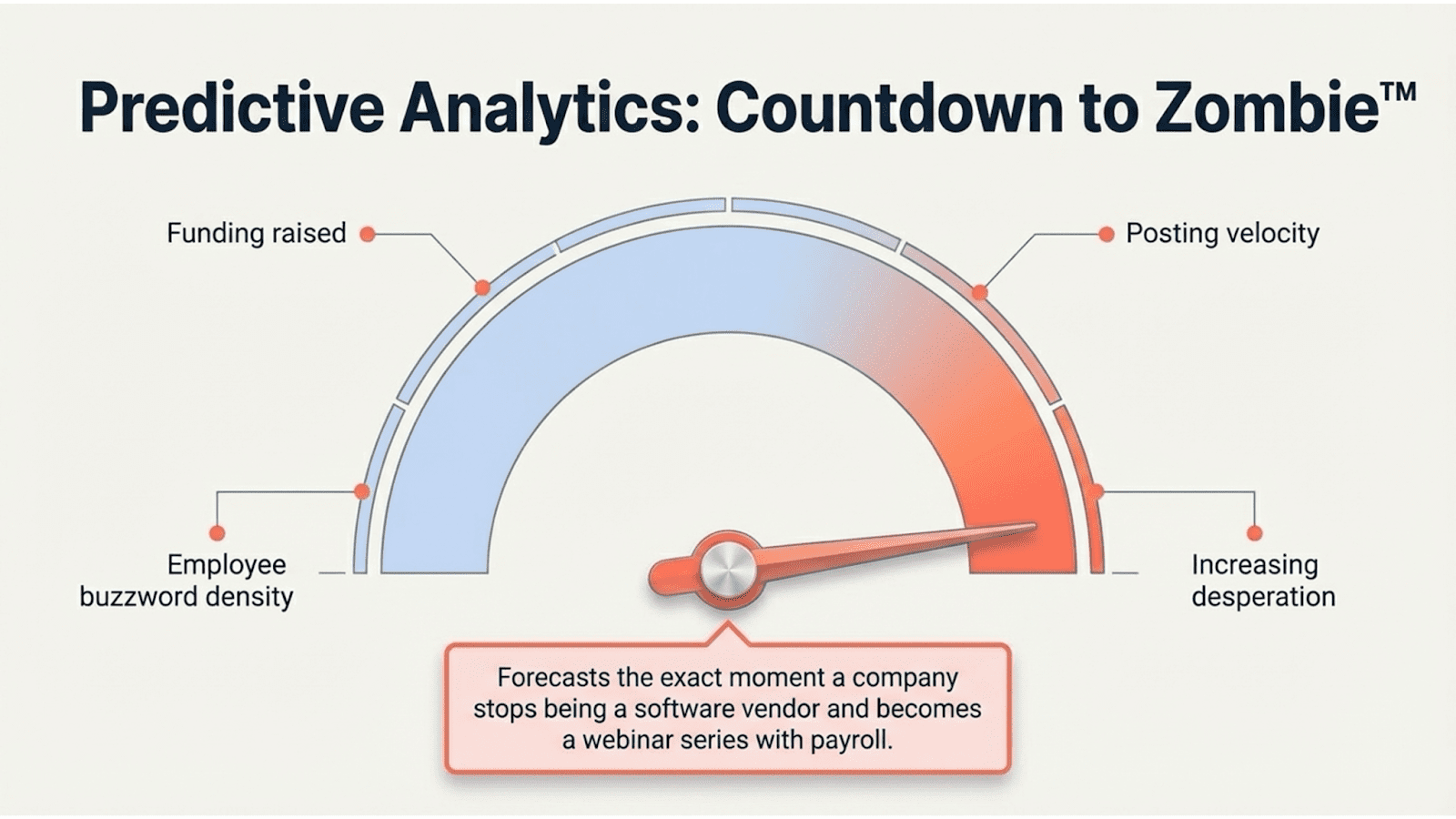 It tracks funding, posting speed, how often employees use buzzwords, and rising desperation. Then it predicts when the company will stop selling software and become just a webinar series with a payroll.