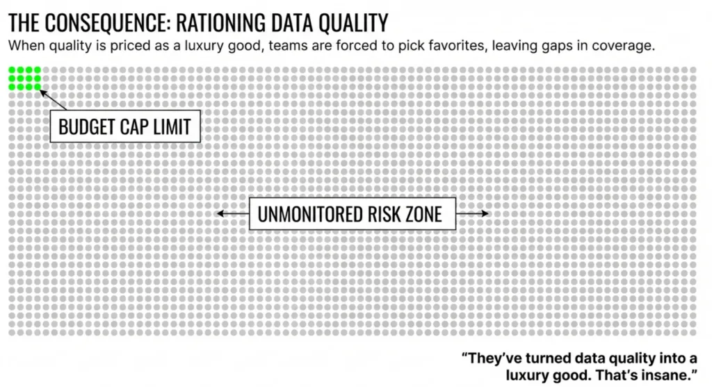 Got 10,000 tables? Congratulations. You now need a six-figure budget just to find out whether your data is broken. So you don’t test everything. You pick favorites. You cross your fingers. And when bad data sneaks through the tables you couldn’t afford to monitor? That’s your problem, not theirs.