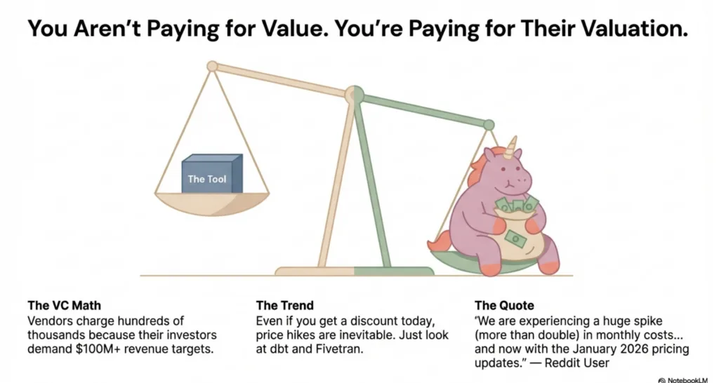 Even if you’re getting a discount today, a price hike is coming. Look at what happened with dbt and Fivetran. One Reddit user put it plainly: “We are experiencing a huge spike (more than double) in monthly costs following the March 2025 changes, and now with the January 2026 pricing updates.” Every year brings a new price increase, and pay-per-usage models make it worse. Your costs rise automatically as your data grows.