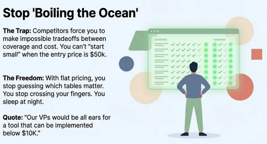 With per-table pricing, your bill grows linearly (or worse) with your data. With flat pricing, you can actually afford to monitor everything. You stop guessing which tables matter. You stop crossing your fingers. You sleep at night.