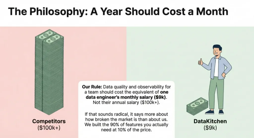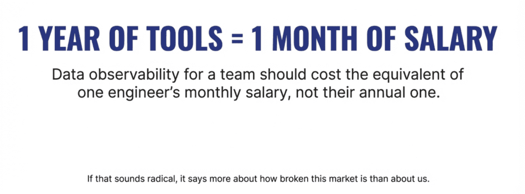 Here’s what we believe: data quality and observability for a small team for an entire year should cost the equivalent of one data engineer’s monthly salary.