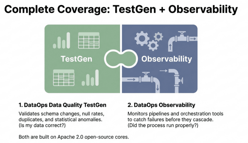 TestGen validates your actual data: schema changes, null rates, duplicates, referential integrity, sand tatistical anomalies. Observability monitors your pipelines, transformations, and orchestration tools to catch failures before they cascade downstream.