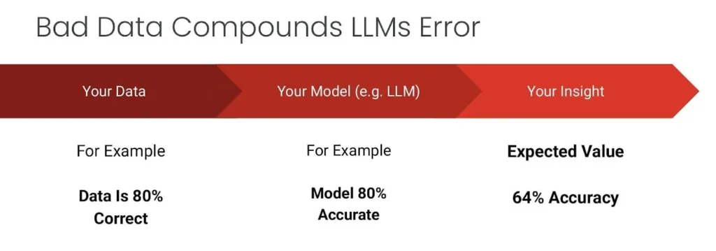 Here’s a sobering reality that many organizations are just beginning to grasp: LLMs don’t magically fix insufficient data; they amplify its impact. Consider a typical scenario where your data is 80% correct and your LLM is 80% accurate. Simple multiplication tells us that your expected output accuracy drops to just 64%. This compounding effect means that data quality issues that might have been tolerable in traditional analytics become catastrophic when fed through AI systems.