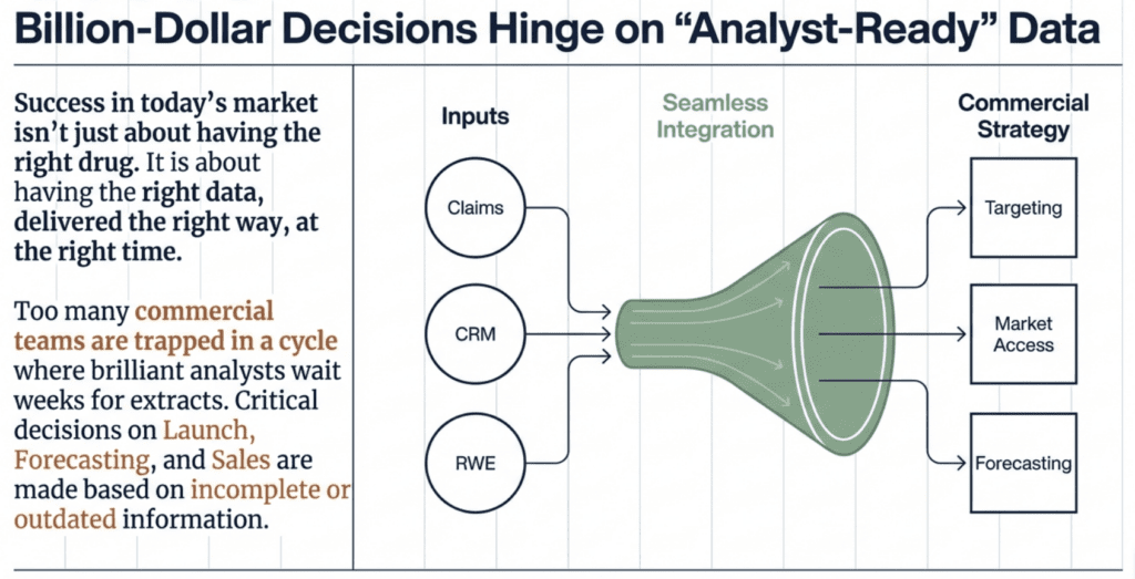 Commercial pharmaceuticals, where billion-dollar decisions hinge on data-driven insights, success isn’t just about having the right drug—it’s about having the right data, delivered the right way, at the right time. Yet, too many pharmaceutical companies find themselves trapped in a frustrating cycle: brilliant analysts wait weeks for data extracts, IT teams are overwhelmed by competing priorities, and commercial teams make critical decisions based on incomplete or outdated information.