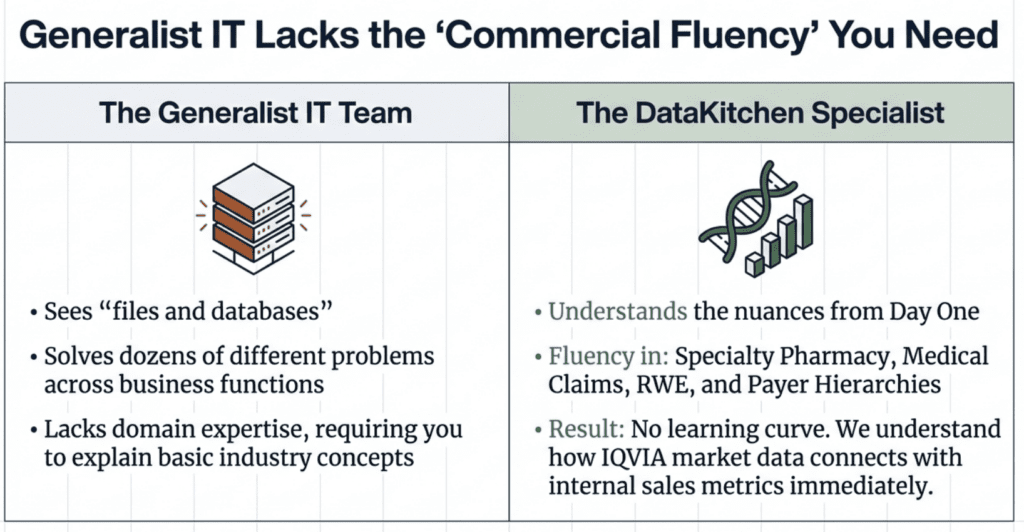 The root issue isn’t technical capability—it’s focus and specialization. General IT teams, regardless of skill level, often lack the deep domain expertise needed to fully understand the nuances of specialty pharmacy data, medical claims integration, or real-world evidence datasets. They’re solving dozens of different problems across multiple business functions, while commercial analytics requires dedicated attention to a specific set of complex data challenges.