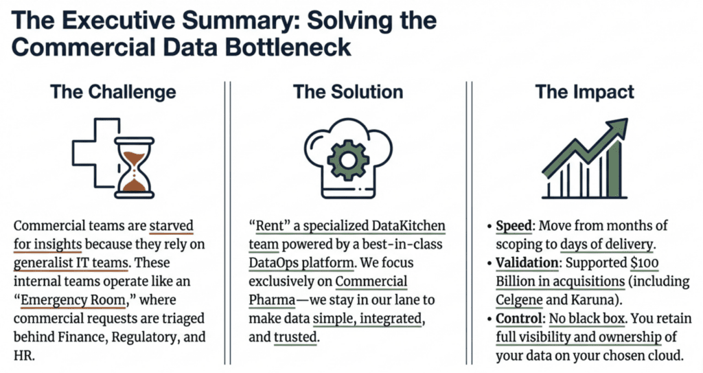 DataKitchen’s specialized approach offers a compelling alternative to traditional IT-driven data projects. By combining deep pharmaceutical industry expertise, proven delivery capability, transparent operations, and modern technology infrastructure, they enable commercial teams to access the data foundation they need without the typical delays, complications, and uncertainties associated with internal IT initiatives.