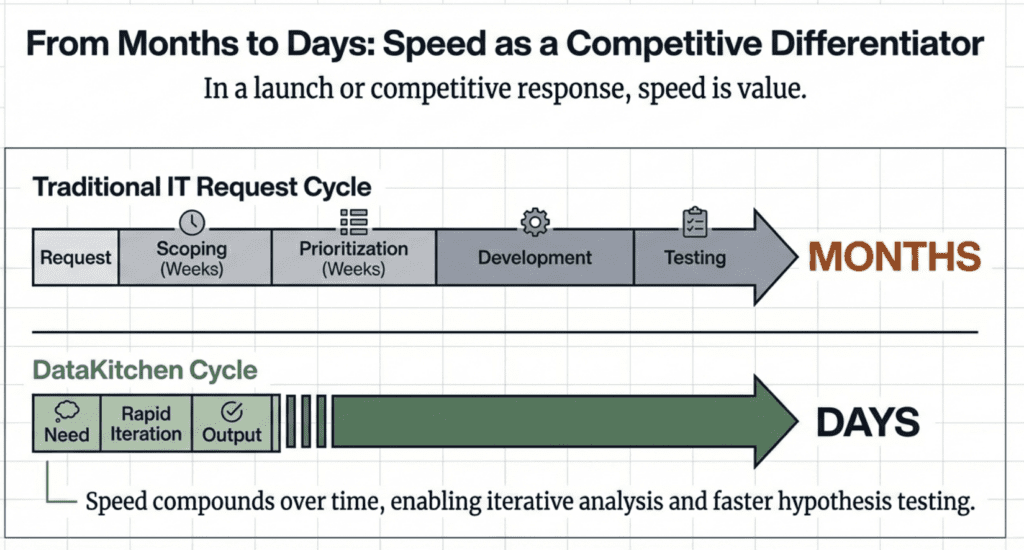 The DataKitchen model completely reverses this dynamic. Because they maintain integrated, analyst-ready commercial data as their core focus, responding to new analytical needs becomes a matter of hours or days rather than weeks or months. This speed advantage compounds over time, enabling more iterative analysis, faster hypothesis testing, and ultimately more responsive commercial strategies.