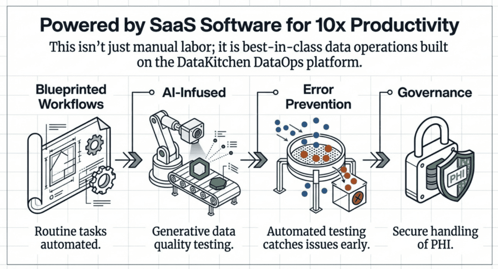 Behind the specialized team and domain expertise lies DataKitchen’s purpose-built SaaS DataOps platform, explicitly designed for best-in-class data operations. This technology foundation addresses three critical requirements for pharmaceutical data infrastructure: error prevention, productivity enhancement, and security compliance.  This software makes any data team more productive.   And they are such fanatics about data team productivity, quality, and customer focus that they have written two books about the ideas,