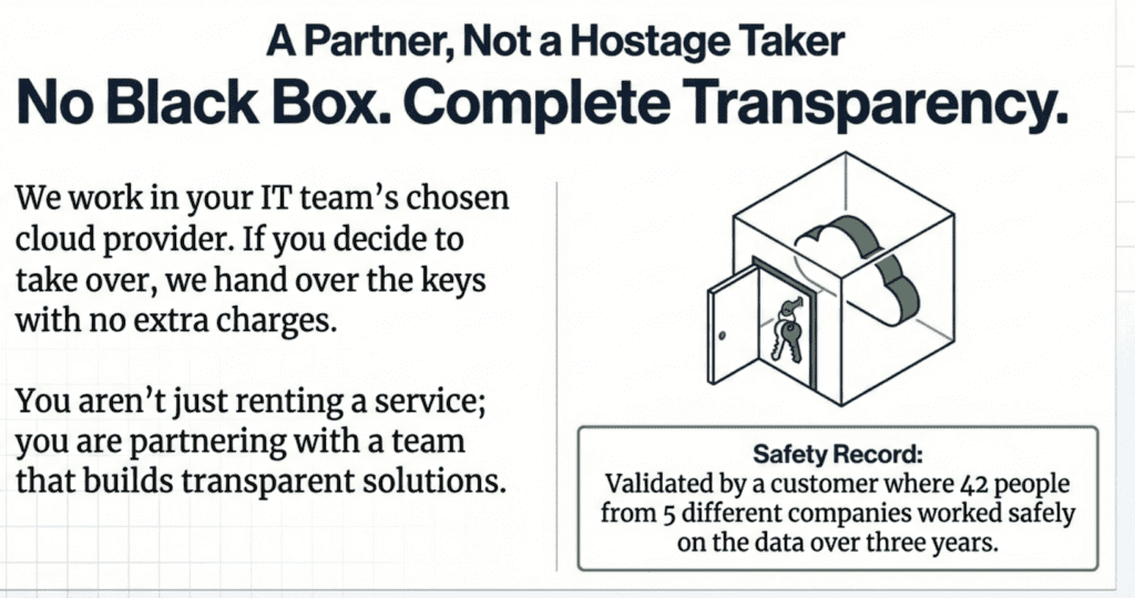 The transparency aspect extends to DataKitchen’s explicit commitment to avoiding black box solutions. When they state that the eventual IT takeover involves “no black box, no extra charges,” they’re addressing one of the most common concerns about outsourced data services. You’re not just renting a service—you’re partnering with a team that builds transparent, transferable solutions. This approach mitigates vendor lock-in concerns while ensuring that your organization maintains complete visibility into how its critical data infrastructure operates.  One customer has had 42 people from 5 companies work safely on data over three years
