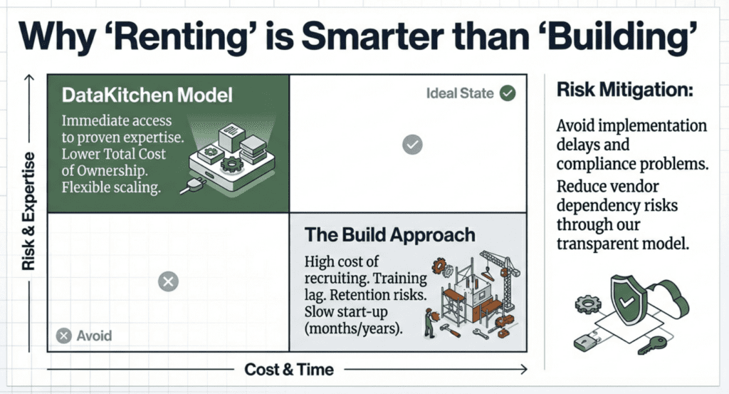 For commercial pharmaceutical leaders evaluating data infrastructure investments, the DataKitchen model presents compelling advantages across multiple dimensions. From a cost perspective, hiring a dedicated data team often proves more economical than expanding internal IT capabilities, particularly when considering the full cost of recruiting, training, and retaining specialized talent.