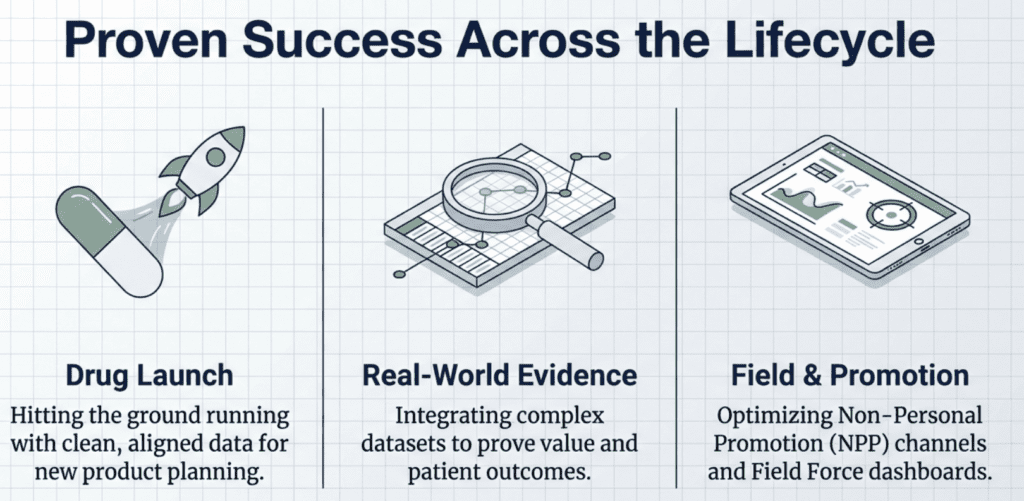 Consider how this specialized focus translates into practical benefits for your daily work. When you need to integrate IQVIA market data with your internal sales performance metrics, you’re working with a team that understands exactly how these datasets should connect, what common integration challenges to expect, and how to deliver analyst-ready data that requires minimal additional processing. This isn’t generic data engineering—it’s commercial pharma data engineering, built on decades of specific industry experience.