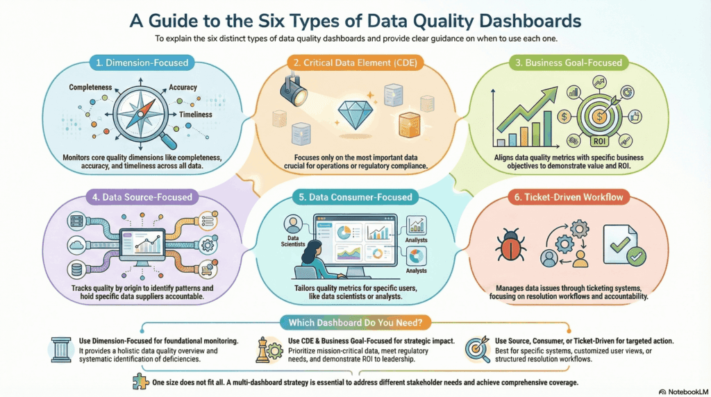 The blog explains that there is no single “data quality dashboard.” Instead, dashboards vary widely because different stakeholders need different views of data quality. The article outlines six types of dashboards—KPI dashboards, data element dashboards, business goal dashboards, source-oriented dashboards, consumer-oriented dashboards, and operational dashboards—and shows how each reflects a different purpose, audience, and definition of “quality.” The central message: the best dashboard is the one aligned to the user’s goals, not the one with the most metrics.